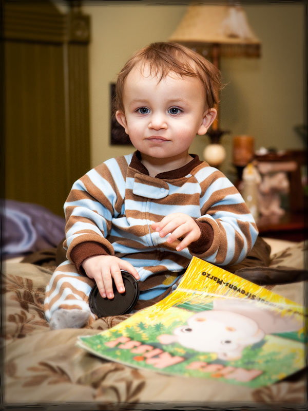 Becky fed him a bottle, read him a story, and put him to bed shortly before 8:00. We put some saline in his nose just before we put him down for the night. That got his diaper in a twist, but he soon got over it and didn’t make a bit of noise once Becky laid him down.